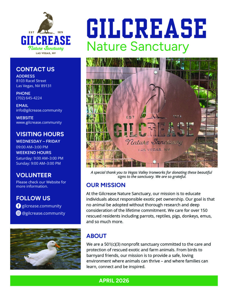 Trustindex verifies that the original source of the review is Google. Great nature reserve, and especially suitable for younger children as there are lots of opportunities to pet and feed - goats, chickens, geese - and some very loud birds. Take hand sanitiser.Posted on JeffMay 19, 2025Trustindex verifies that the original source of the review is Google. Gilcrease Nature Sanctuary is a hidden gem in Las Vegas. The place is clean, peaceful, and clearly dedicated to the well-being of its animals and birds. Every animal is well taken care of, and you can feel the love and effort that goes into maintaining such a welcoming environment. It’s a fun and family-friendly destination where kids and adults alike can enjoy a close-up experience with a variety of animals. Each visit is not only enjoyable but also educational—there’s always something new to learn about animal care, conservation, and nature. Whether you’re a local or just visiting, Gilcrease is a wonderful place to reconnect with nature and support a great cause.Posted on Kristina MillerMay 17, 2025Trustindex verifies that the original source of the review is Google. Fun placePosted on Olga KukukMay 17, 2025Trustindex verifies that the original source of the review is Google. Posted on William PincusMay 3, 2025Trustindex verifies that the original source of the review is Google. Please support this place. This is clearly a passion project from the founder and it seems all the money goes into this sanctuary. Very affordable, my boyfriend and I loved it. I wish the parrots had larger cages, but that is so expensive that the only way to fix this is to have more money. However their food bowls are filled with fruits and vegetables, and most of the cages have toys. They also have fresh water. It's very clear the money they do get is put into these animals. Loved it.Posted on Minerva HaywoodMay 3, 2025Trustindex verifies that the original source of the review is Google. The place was so fun to explore! A really great place for families to have a great time in, there was a whole grass and shaded area plus lots of places to sit and relax while kids played and explored. We chatted with one blonde haired lady about the birds, you could tell she has so much love for them the way she treated and cared for them. She even offered me one of her feathers from one of the birds she had been waiting to collect from and thought that was absolutely sweet of her!Posted on Carolina RApril 28, 2025